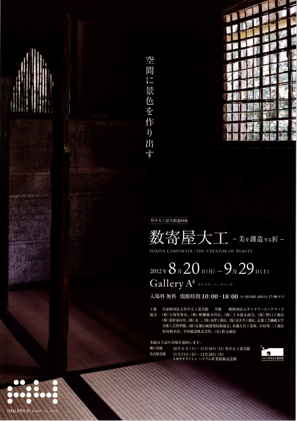 「数寄屋大工-美を創造する匠-」と題した展示が、東陽町駅の竹中工務店東京本店で開催されます。実物大の茶室構造模型をはじめ、銘木、土壁、建具など、職人がつくった美しく繊細な制作物、あるいは名工が用いた 道具や図面など約150点の資料を紹介しています。 神戸と名古屋にも巡回予定ですので、お近くにお越しの際にはお立ち寄りください。